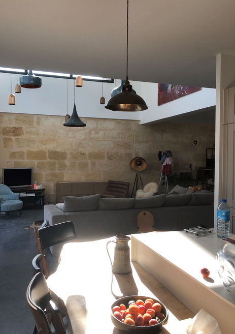 Réhabilitation et surélévation d'une échoppe au Bouscat comprenant: séjour, cuisine ouverture, bureau, 4 chambres, 3 salles de bain, buanderie et cellier. Matériaux utilisés: zinc prépatiné quartz à joint debout, bardage tasseau douglas, couverture zinc, béton quartz et plancher bois massif.