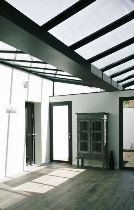 Projet d'extension d'une maison individuelle au Bouscat, autour d'une verrière et d'un patio. Ce projet comprend la création d'une suite parentale, l'extension du séjour et la création d'une bibliothèque. Matériaux utilisés: menuiseries aluminium thermolaquées, verrière aluminium, mortier fin lissé, terrasse douglas.